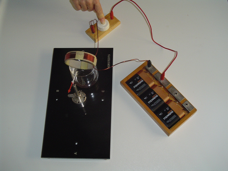 Si costruisce una bobina con filo di rame e cartone e la si connette ad una pila o alimentatore in corrente continua attraverso un interruttore. Quando passa corrente nella bobina un aghetto magnetico posto perpendicolare all’asse della bobina ruoterà proporzionalmente all’intensità di corrente.