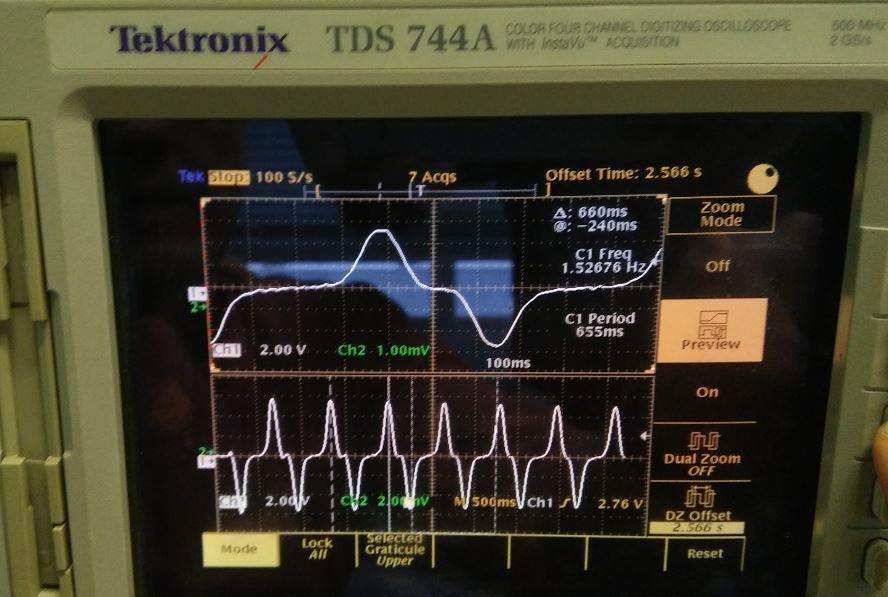 Si imposta sull’asse dei tempi un intervallo di 500 ms/div., mentre per l’asse verticale della tensione si decide di regolare la scala durante le misure. Per la scala delle tensione viene impostato il valore di 2.00 mV/div.