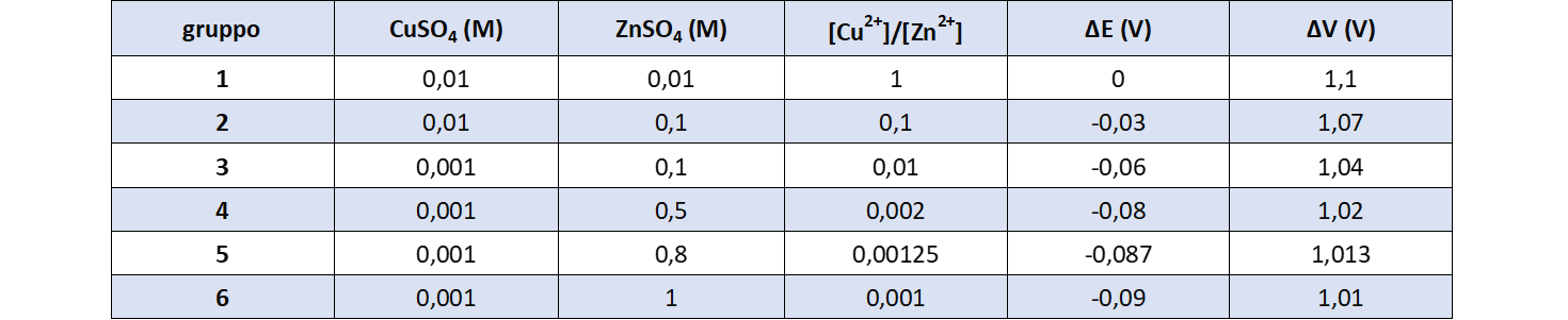 Il potenziale misurato sarà funzione della concentrazione dei sali in soluzione. Per ottenere differenze di potenziale ΔV apprezzabili è necessario un elevato rapporto \([Cu^{2+}]/[Zn^{2+}]\) come si può notare dalla tabella 2.