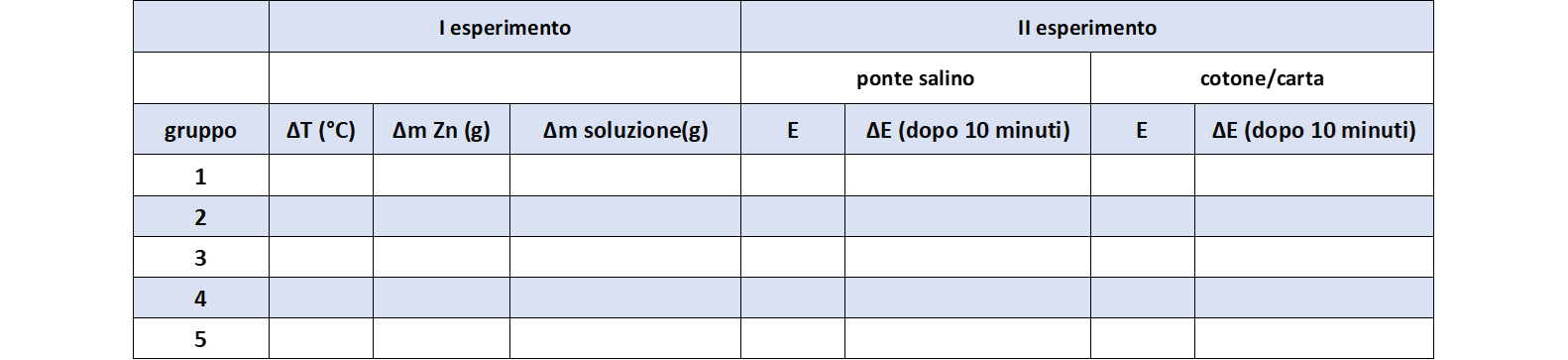 L’esperienza prevede di far reagire in un becker \(CuSO_4 \cdot 5H_2O\) disciolto in acqua con Zn metallico, controllando la variazione di temperatura durante la reazione. La soluzione di solfato di rame azzurrina lentamente si scolorisce a causa della trasformazione del sale di rame in rame metallico rendendo visibile il fenomeno chimico. Il rame metallico di colore rosso, precipita nel fondo del becker mentre la barretta di zinco si consuma. La reazione risulta esotermica. Ogni gruppo lavora con concentrazioni diverse di \(CuSO_4 \cdot 5H_2O\) (quantità variabile da 5 g a 1g vedi tabella nella descrizione dettagliata dell’attività).  Si fanno  pesare la barretta di Zinco e il becker contenente la soluzione prima e dopo l’esperimento. Entrambe le pesate dovrebbero dare il quantitativo di zinco reagito.