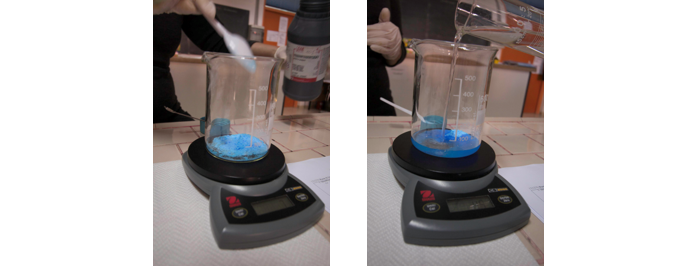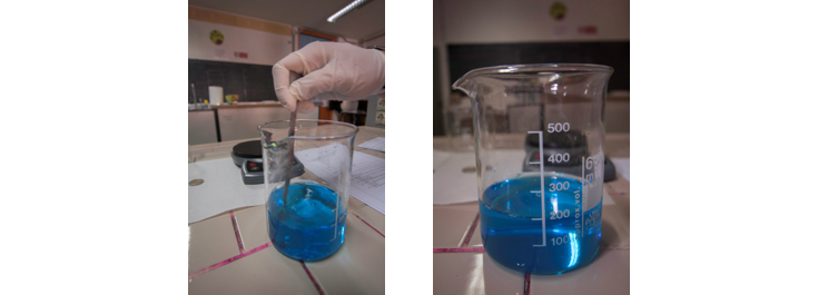 – utilizzando il cucchiaio inserire nel becher la quantità di solfato di rame precedentemente calcolata (16g), è fondamentale l’utilizzo dei guanti per effettuare tale operazione, considerando che il solfato rameico è una sostanza irritante; poi diluire la polvere con 0,2 L di \(H_2O\) (figura 2);