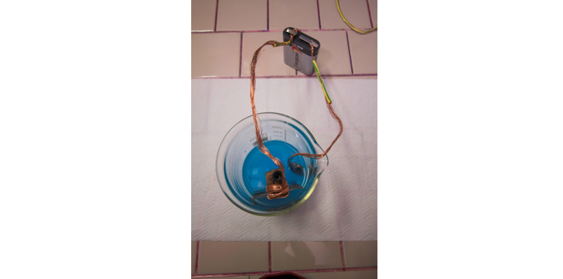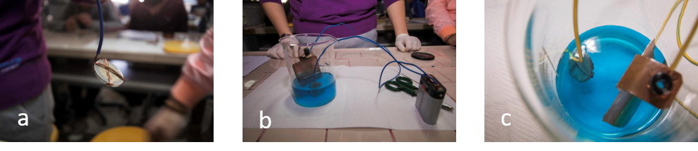 Gli alunni organizzati in piccoli gruppi operano direttamente allestendo in un contenitore di vetro la cella elettrolitica, si usano una pila da 4,5 volt in soluzione di solfato di rame nella quale sono immersi due elettrodi: una lamina di rame e una moneta di altri metalli. Ciascun gruppo allestisce una cella elettrolitica e realizza l’esperienza seguendo le istruzioni di una scheda predisposta contenente anche una traccia di analisi e riflessione.