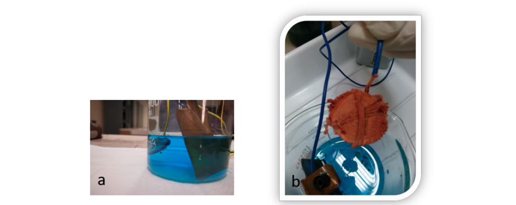 E’ evidente la deposizione di materiale sulla moneta, alcuni gruppi estraggono la moneta e la lamina e le pesano nuovamente, altri gruppi lasciano la cella elettrolitica in azione per altre tre ore, dopo 3 ore e 30 minuti la deposizione è molto evidente (figura 7b).