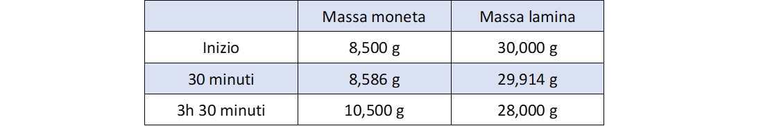 Si osserva come dopo ogni intervallo di tempo la lamina di rame si è consumata, mentre la monetina è aumentata in volume (poiché ricoperta dalla parte del rame perso dalla lamina).