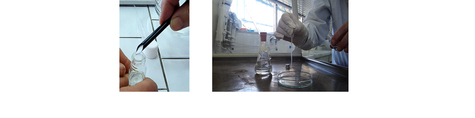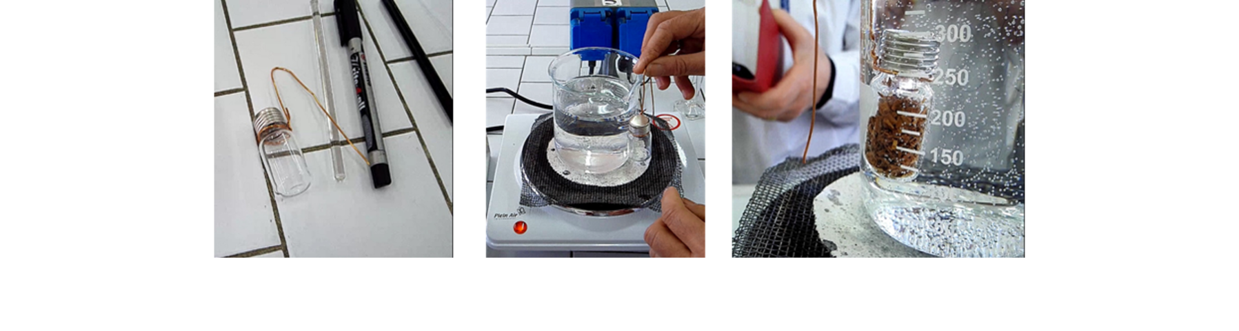 4. Chiudere la fiala con il tappo, assicurandosi che sia ben stretto. Con il filo di rame formare un cappio attorno al collo della fiala e adoperarlo come maniglia (figura 4); usando il filo di rame, immergere la fiala sigillata nel bagnomaria (figura 4) facendo attenzione che non tocchi il fondo e che sia completamente immersa nell’acqua bollente. Se in qualunque momento durante l’estrazione si osserva un flusso di bollicine fuoriuscire dal tappo della fiala, rimuoverla dal bagnomaria, lasciarla raffreddare e stringere ulteriormente il tappo.